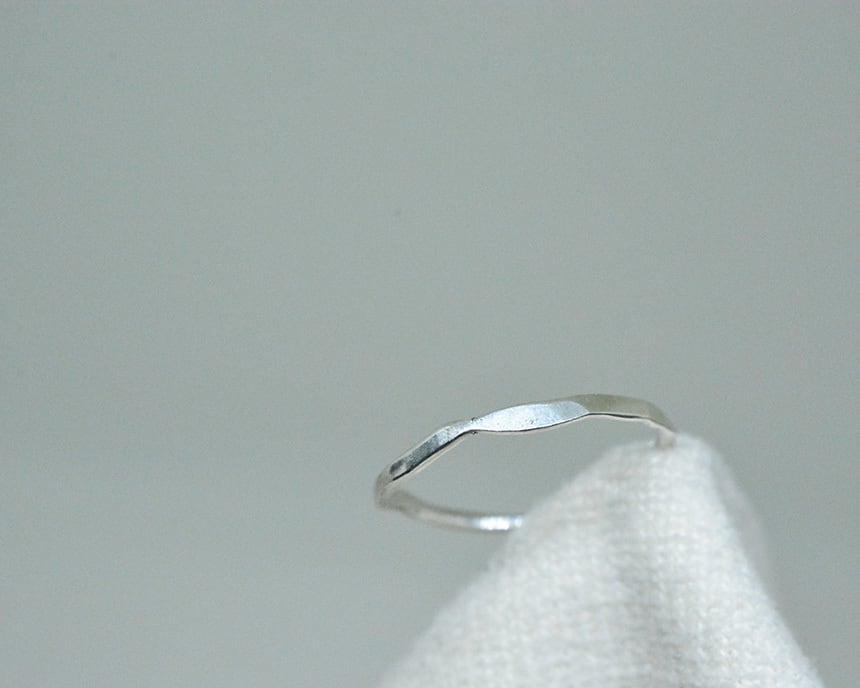 ただ作り手の気まぐれに、叩いたり捻ったり曲げたりしてアクセントを付けて表情を付けたリング。