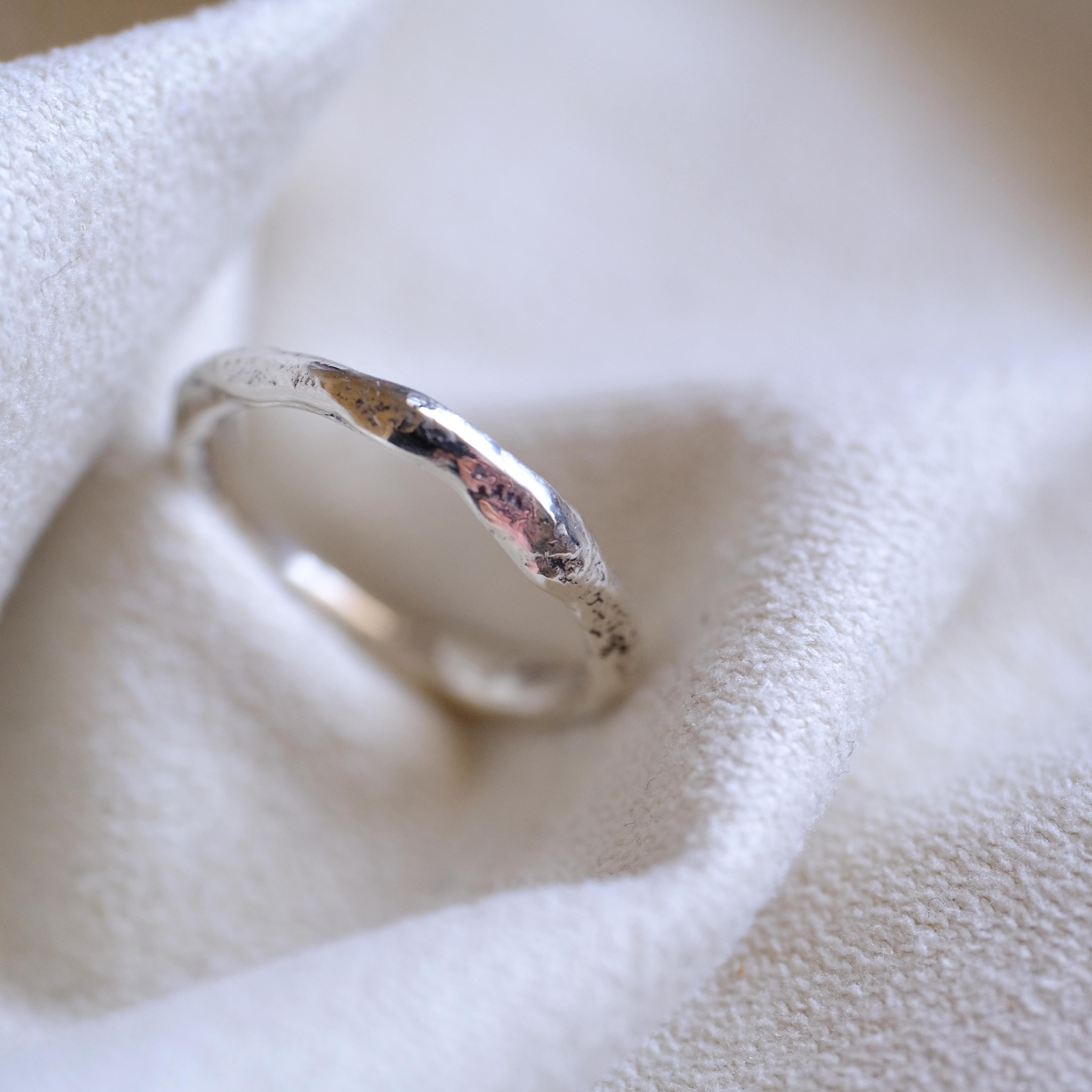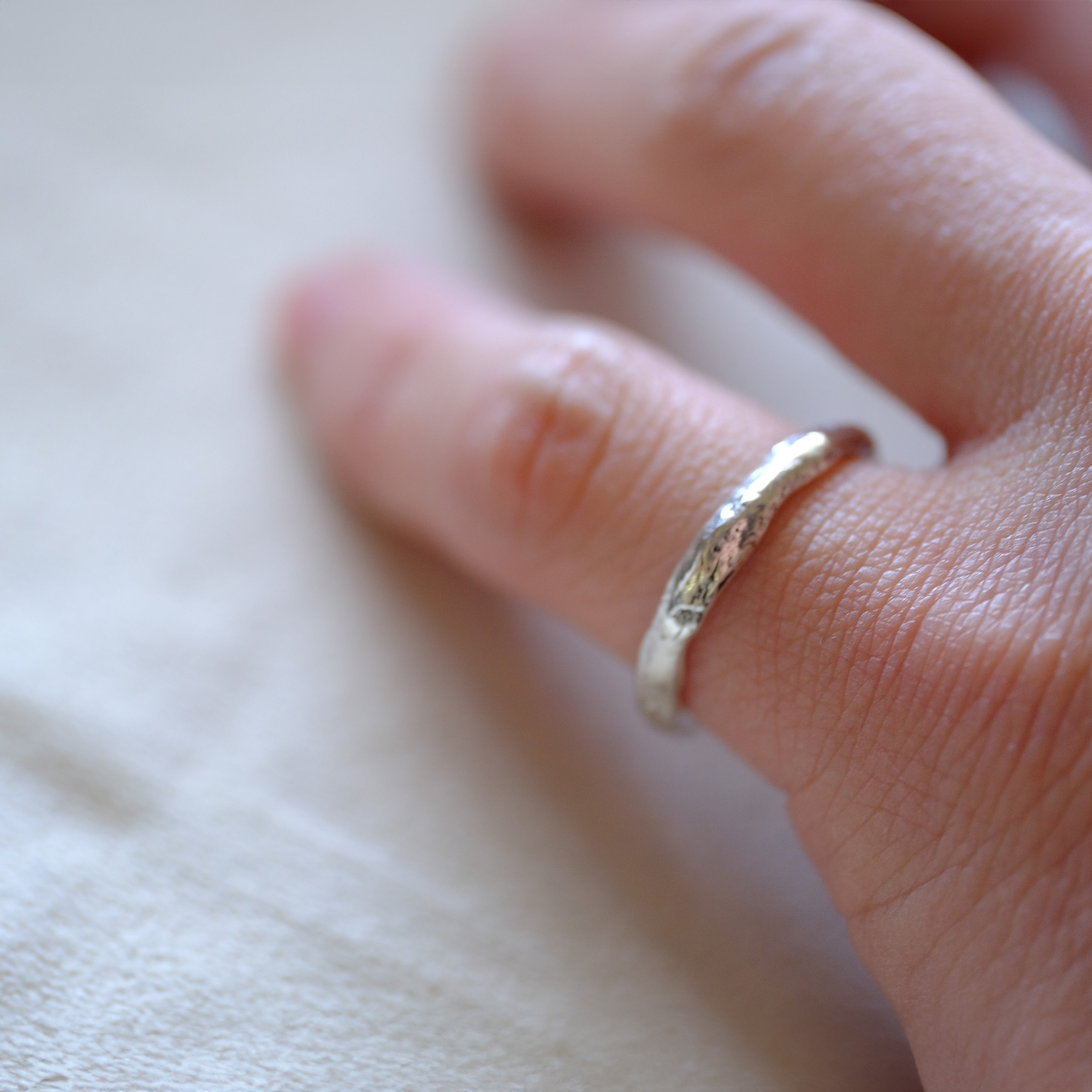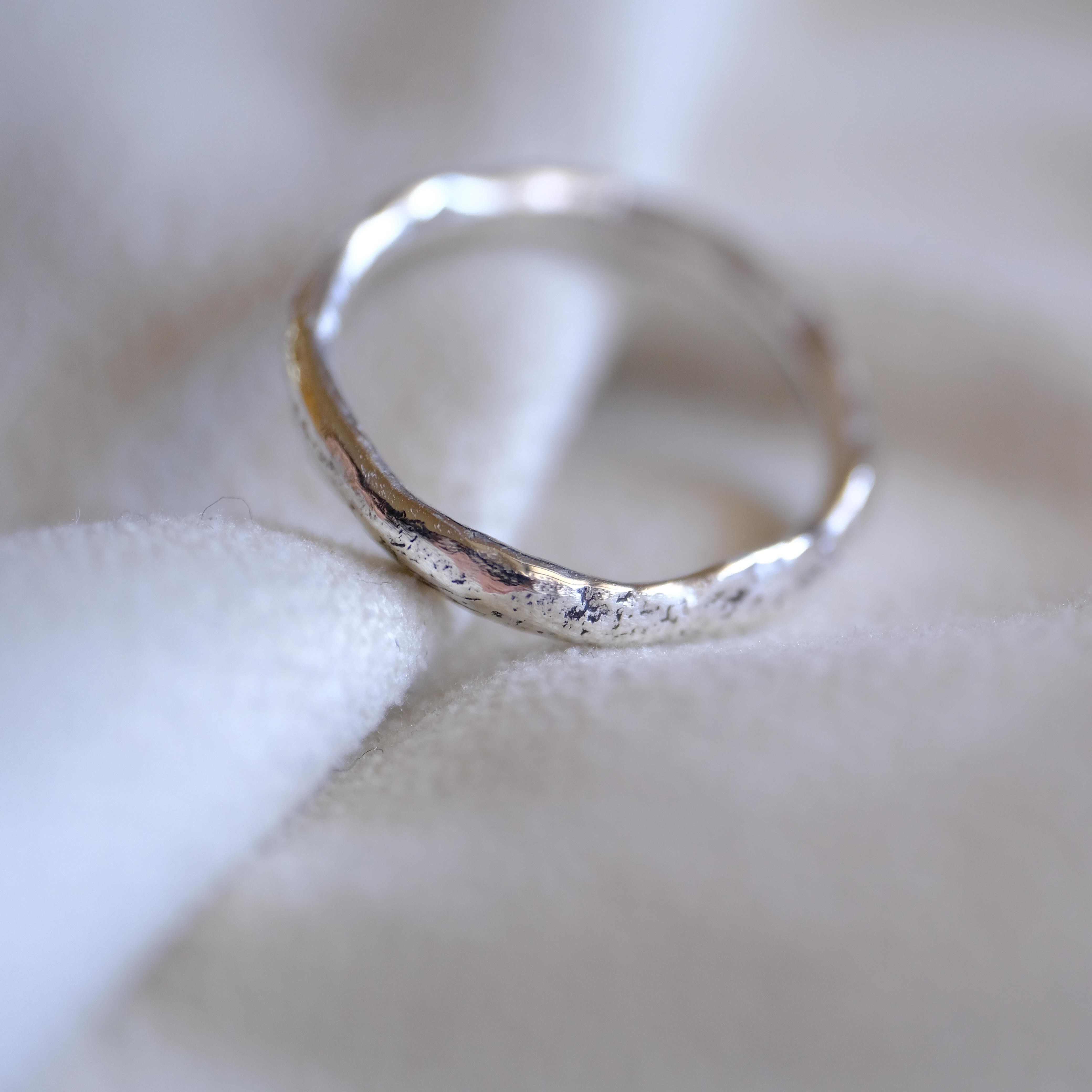 炎で溶かしてリングの形状にしたことで、独特の風合いになりました。