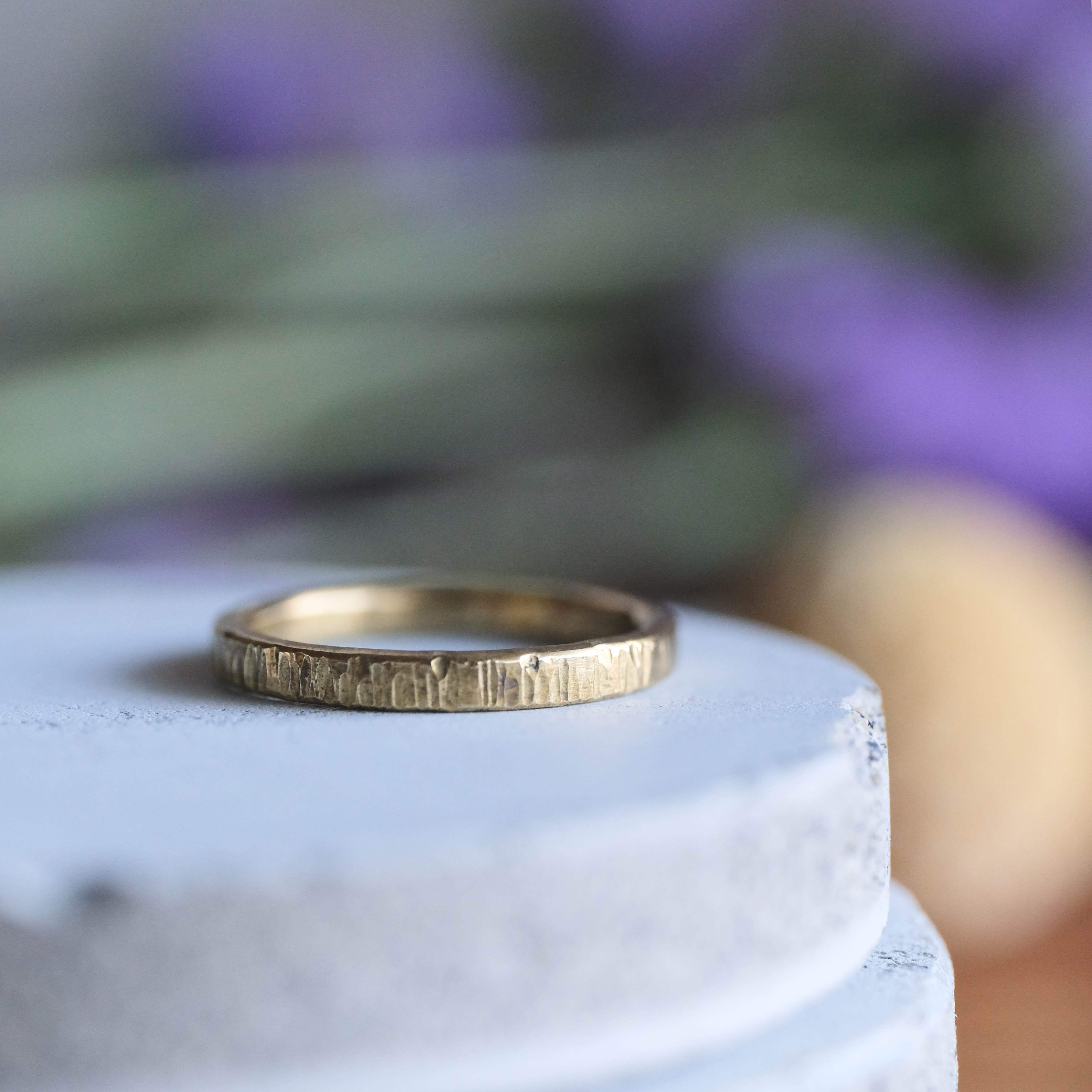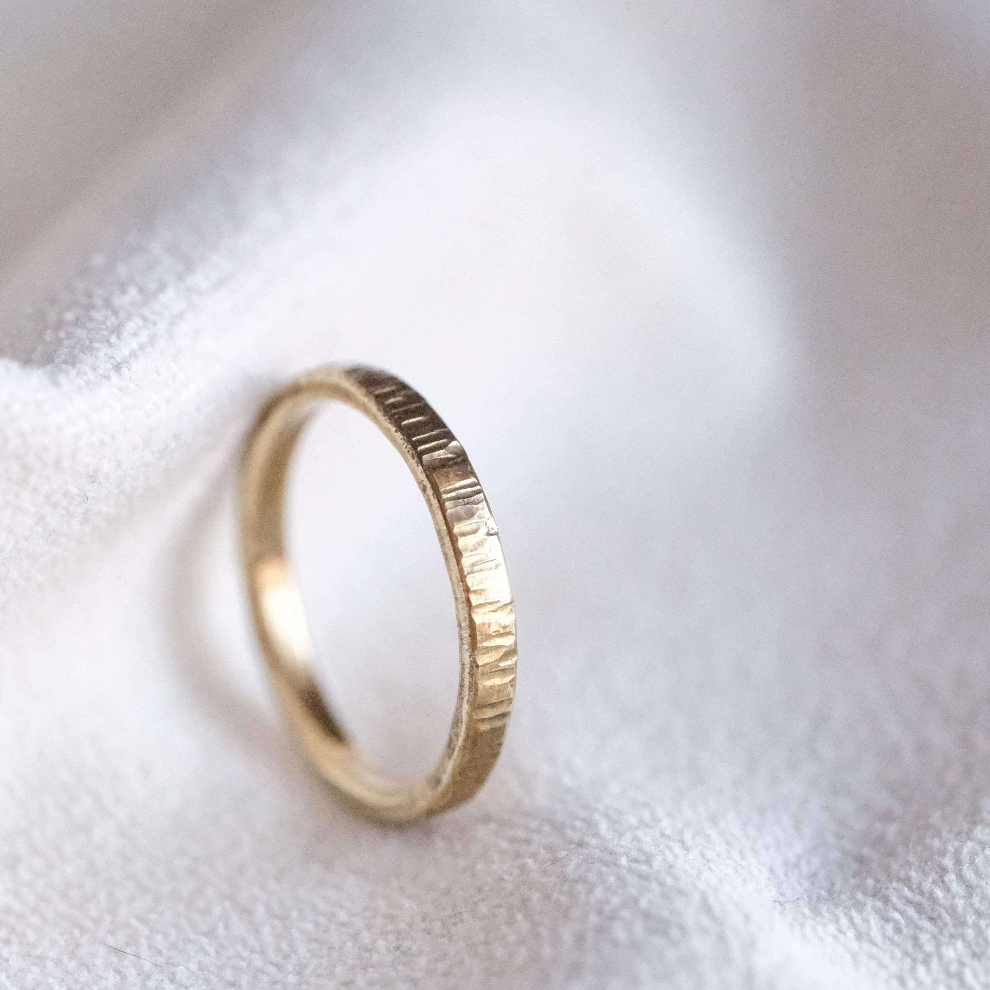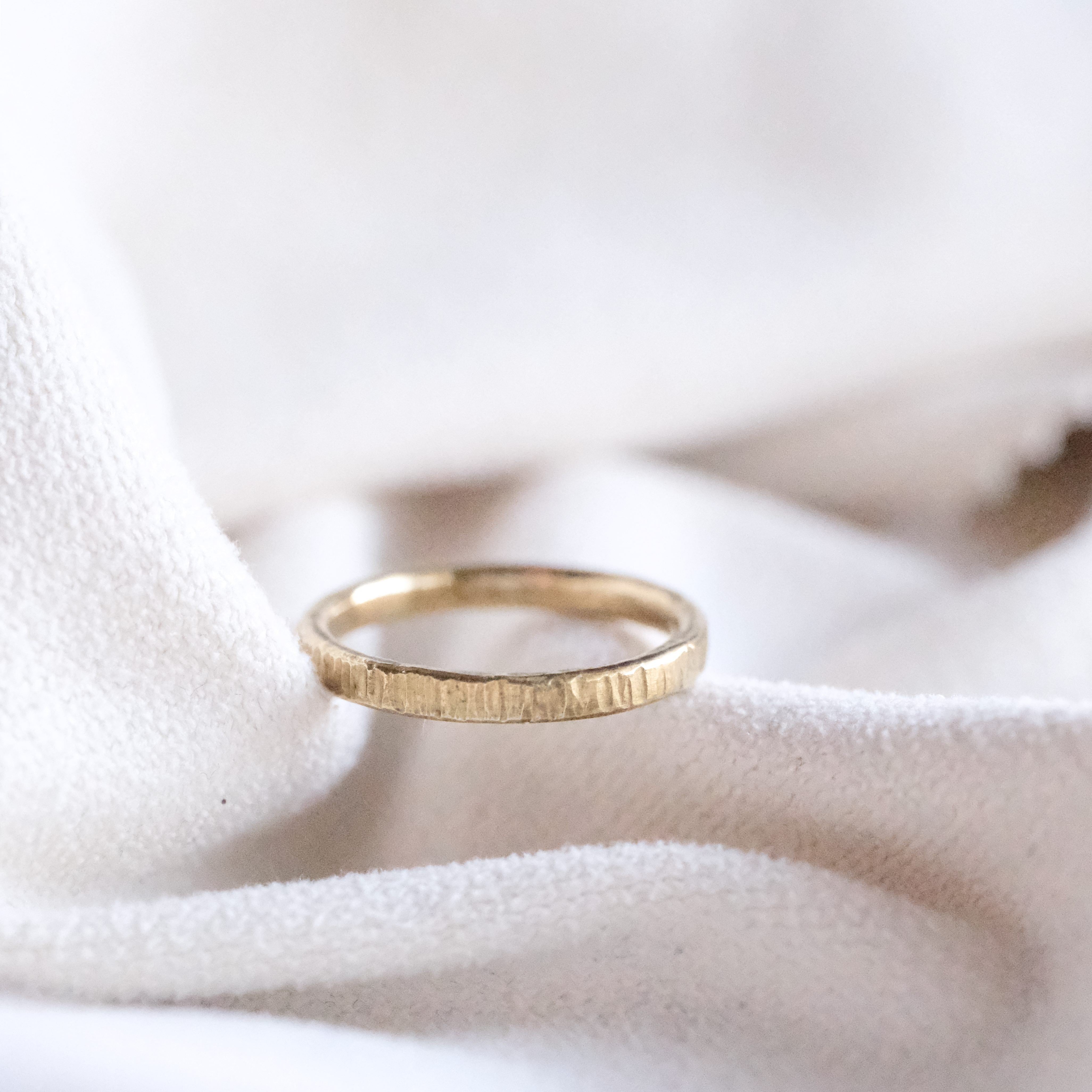 幅2mmほどの平打ちリングに線状の槌目を付けたデザイン。