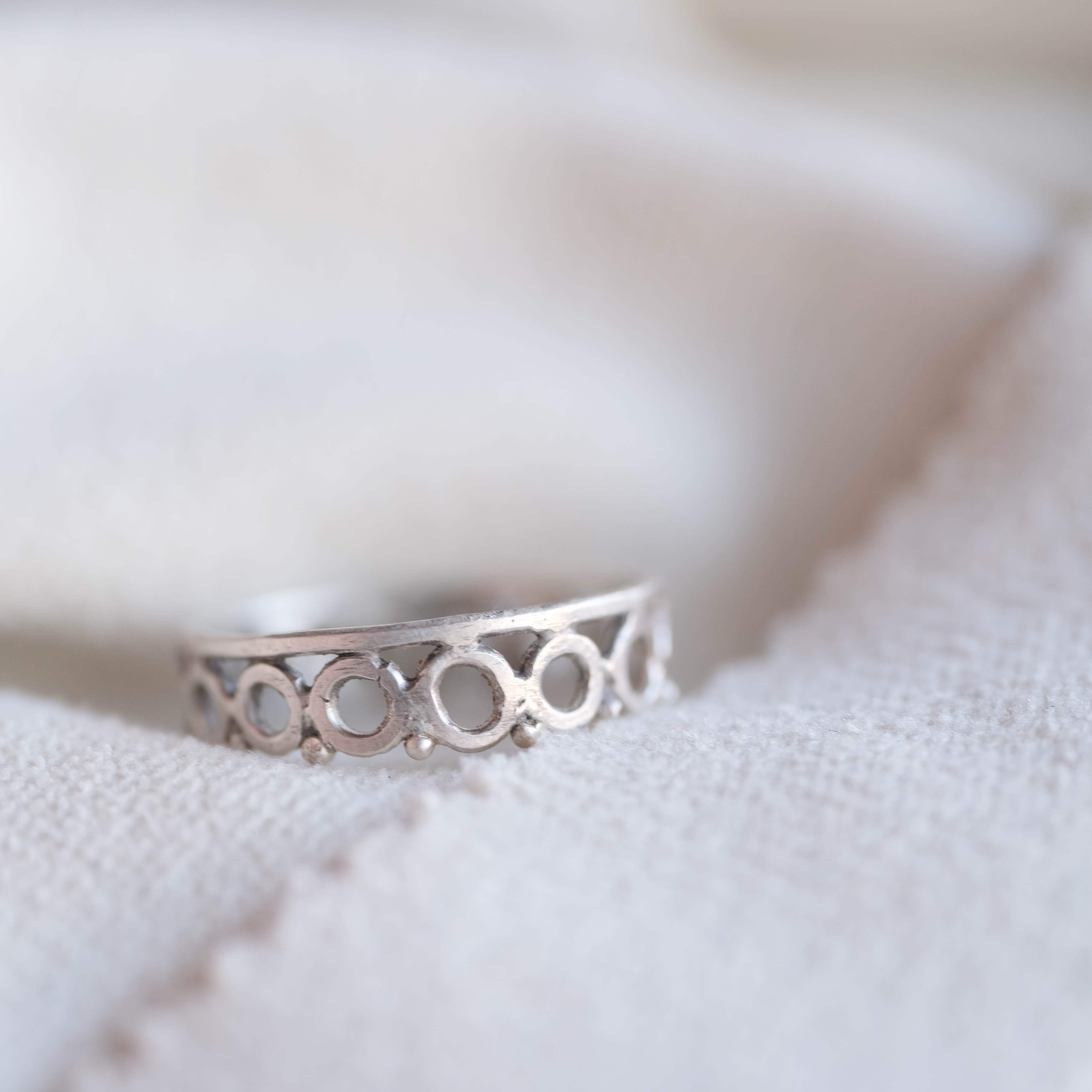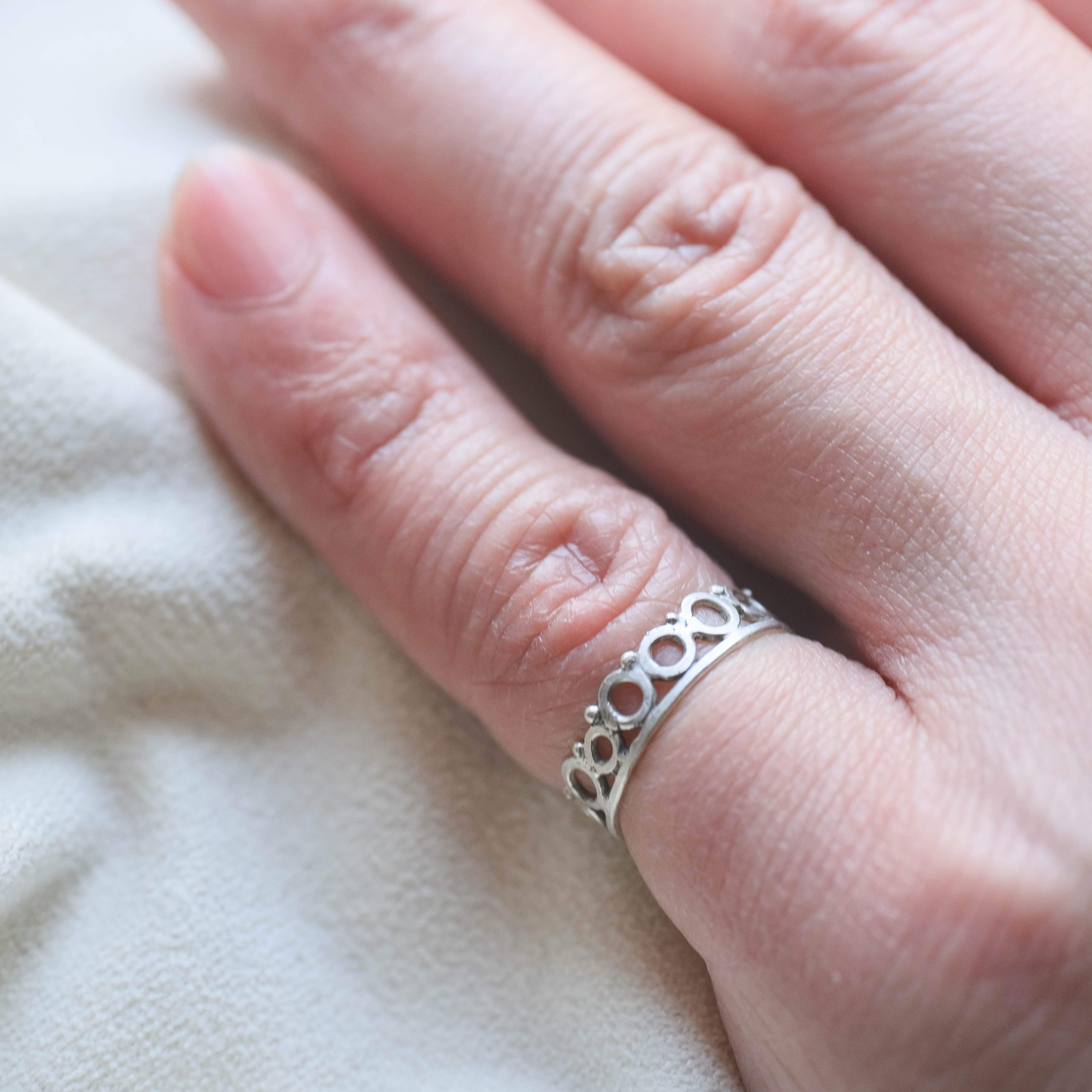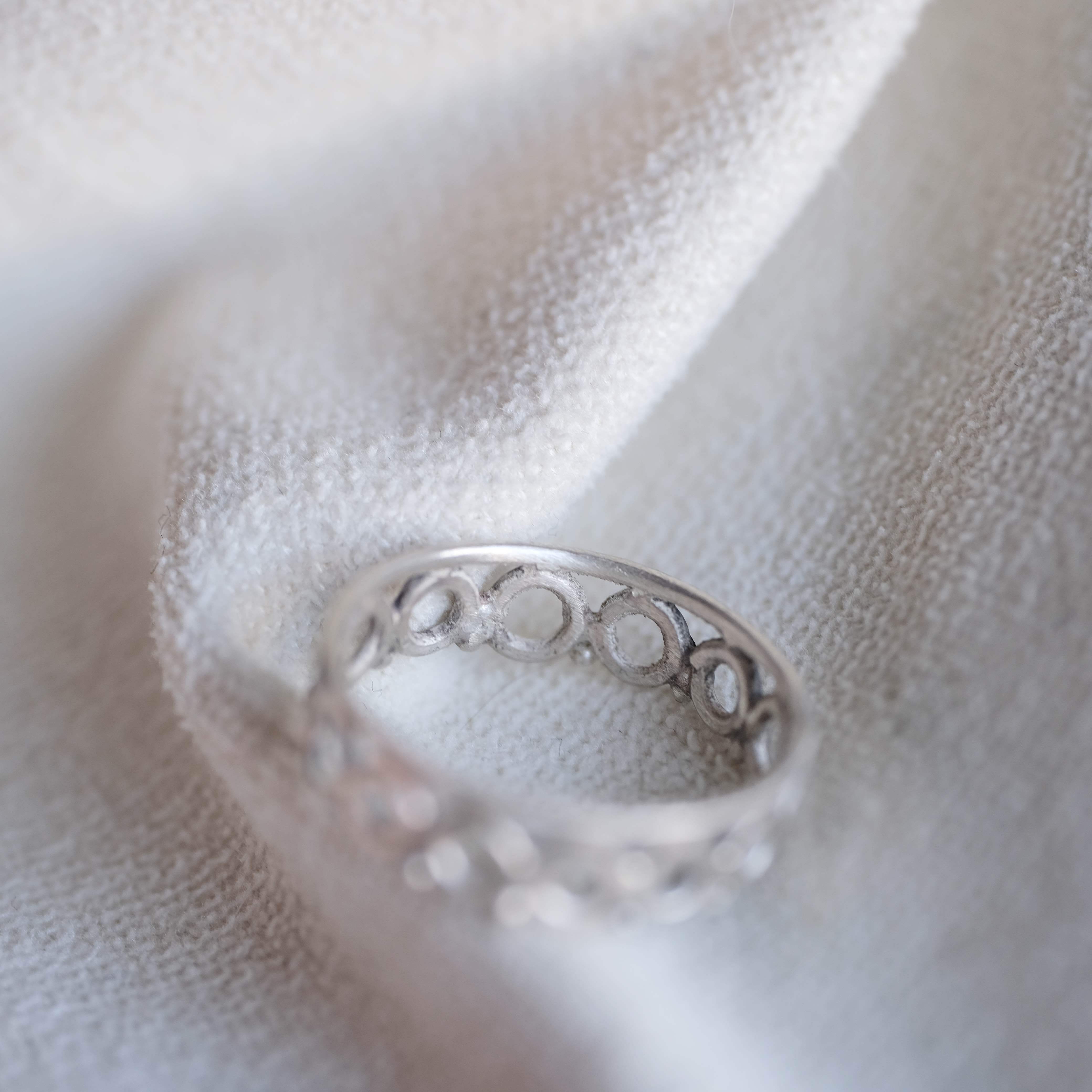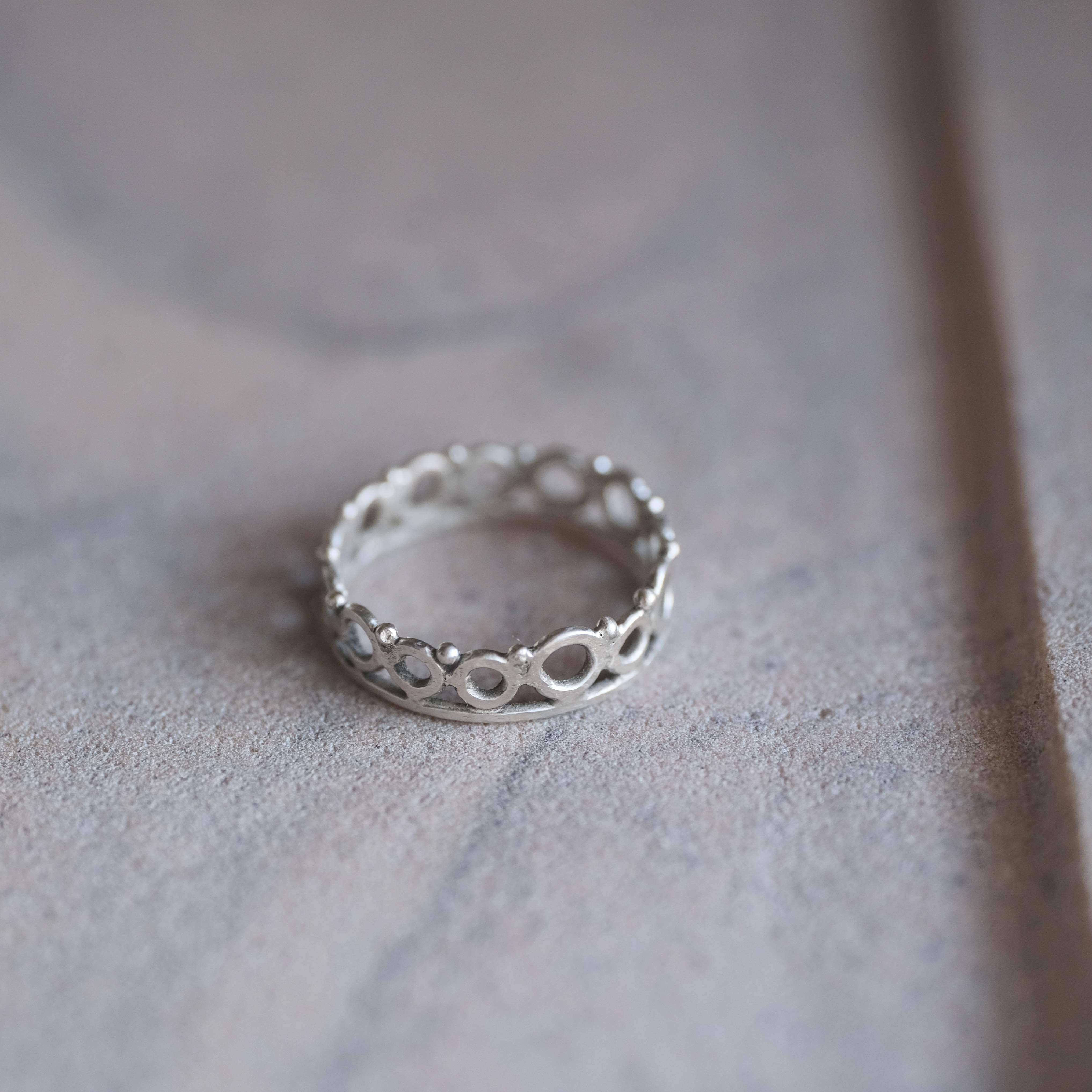 透かし部分が指元にやわらかな影を落とし、角度によってさりげなく表情が変わります。