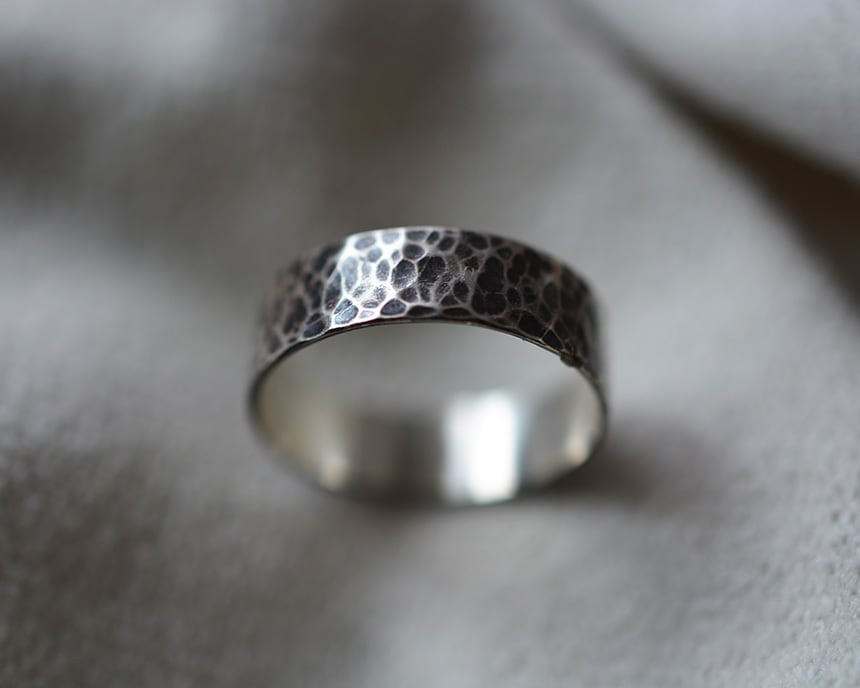 槌目を付けた幅広のリングに、燻し加工をすることでワイルドなデザインにしました。