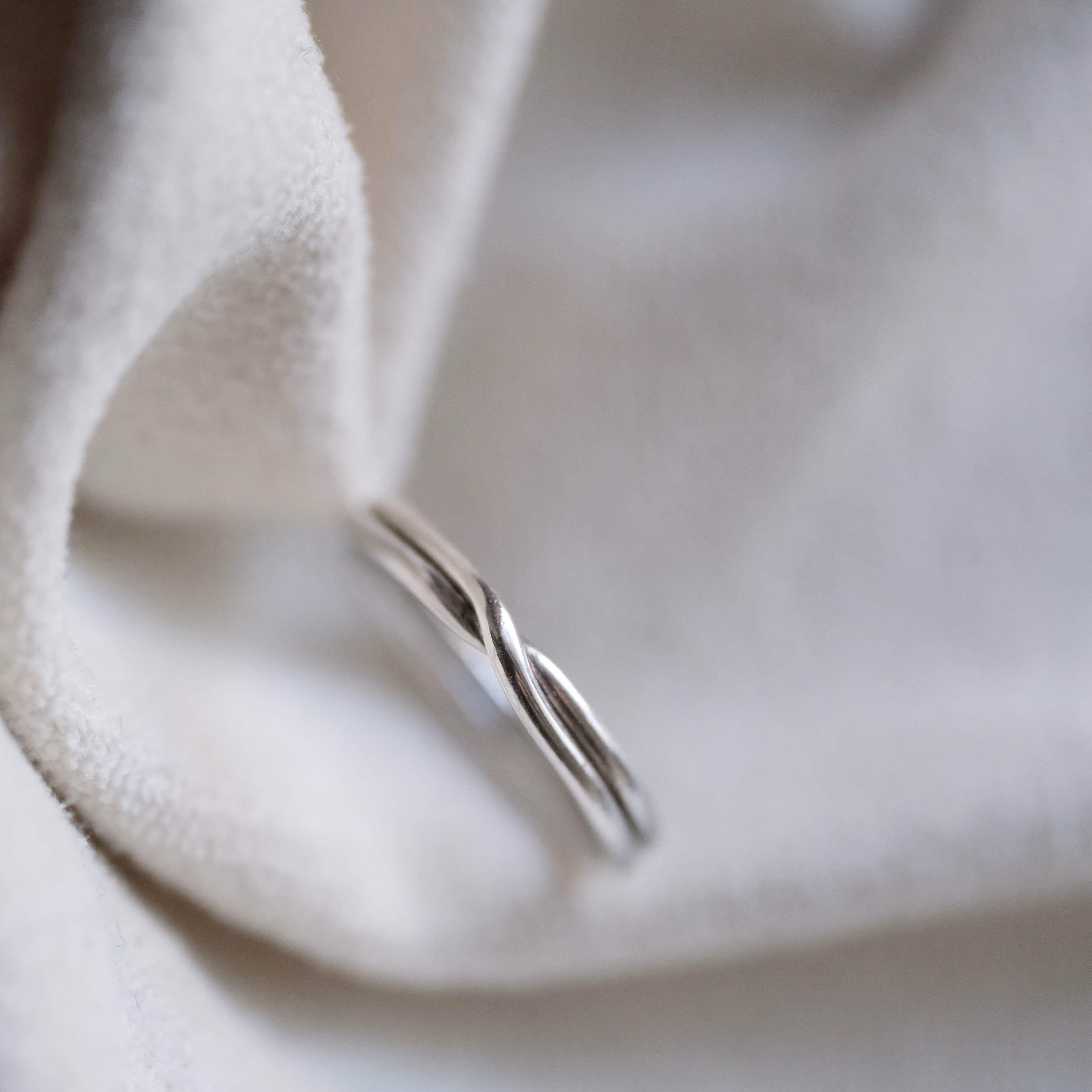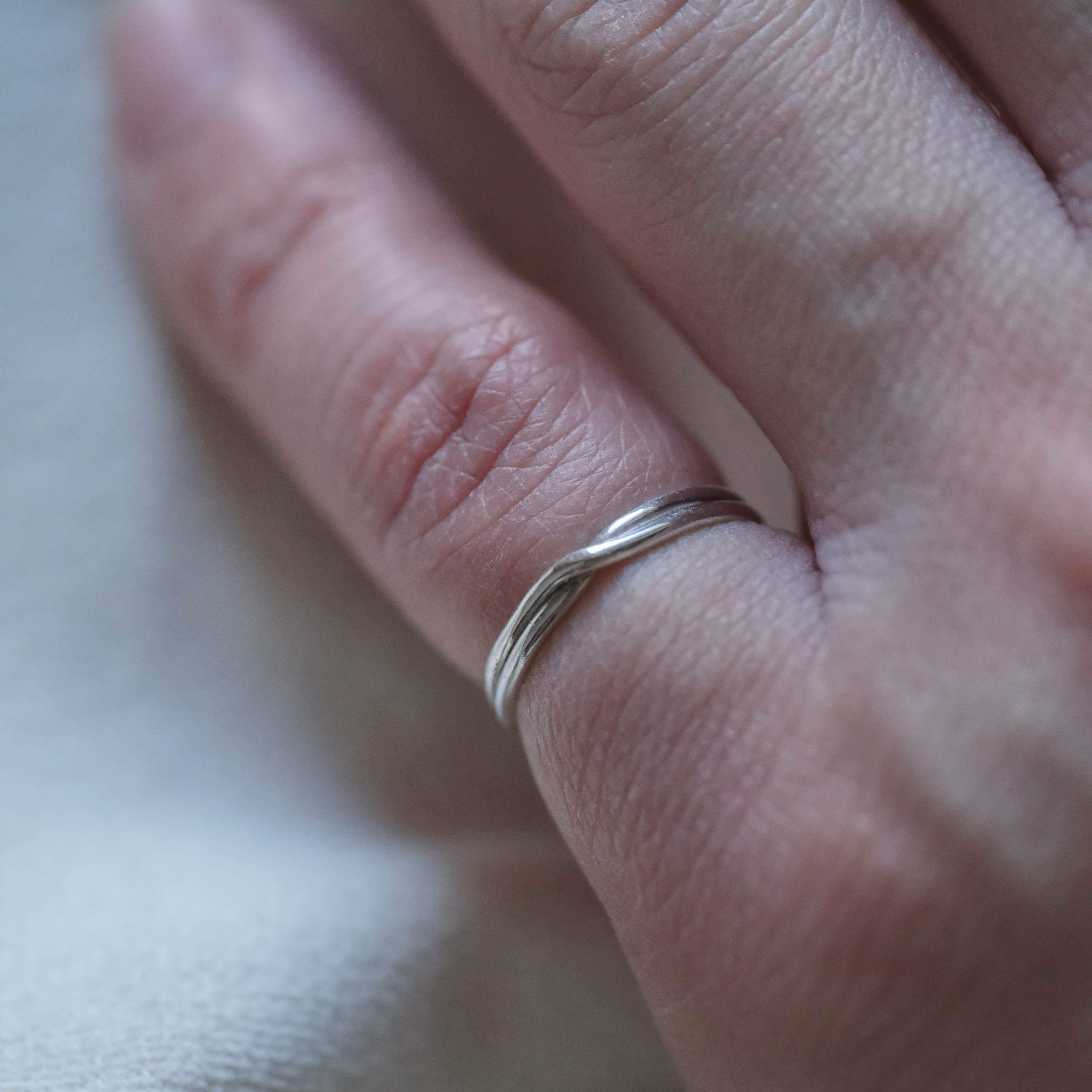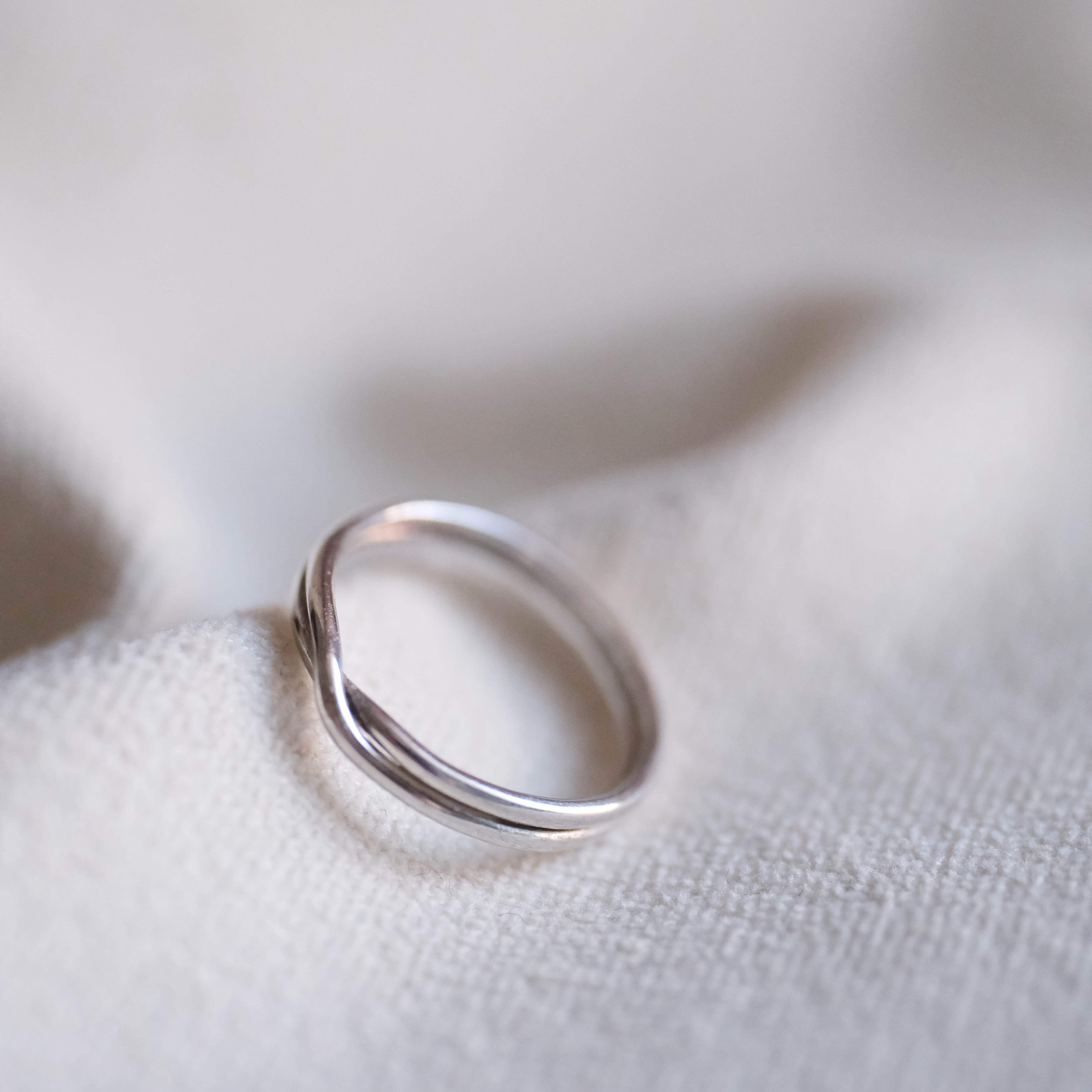 中央でやわらかく交差するラインをポイントに仕立てたシルバー950のダブルリングです。